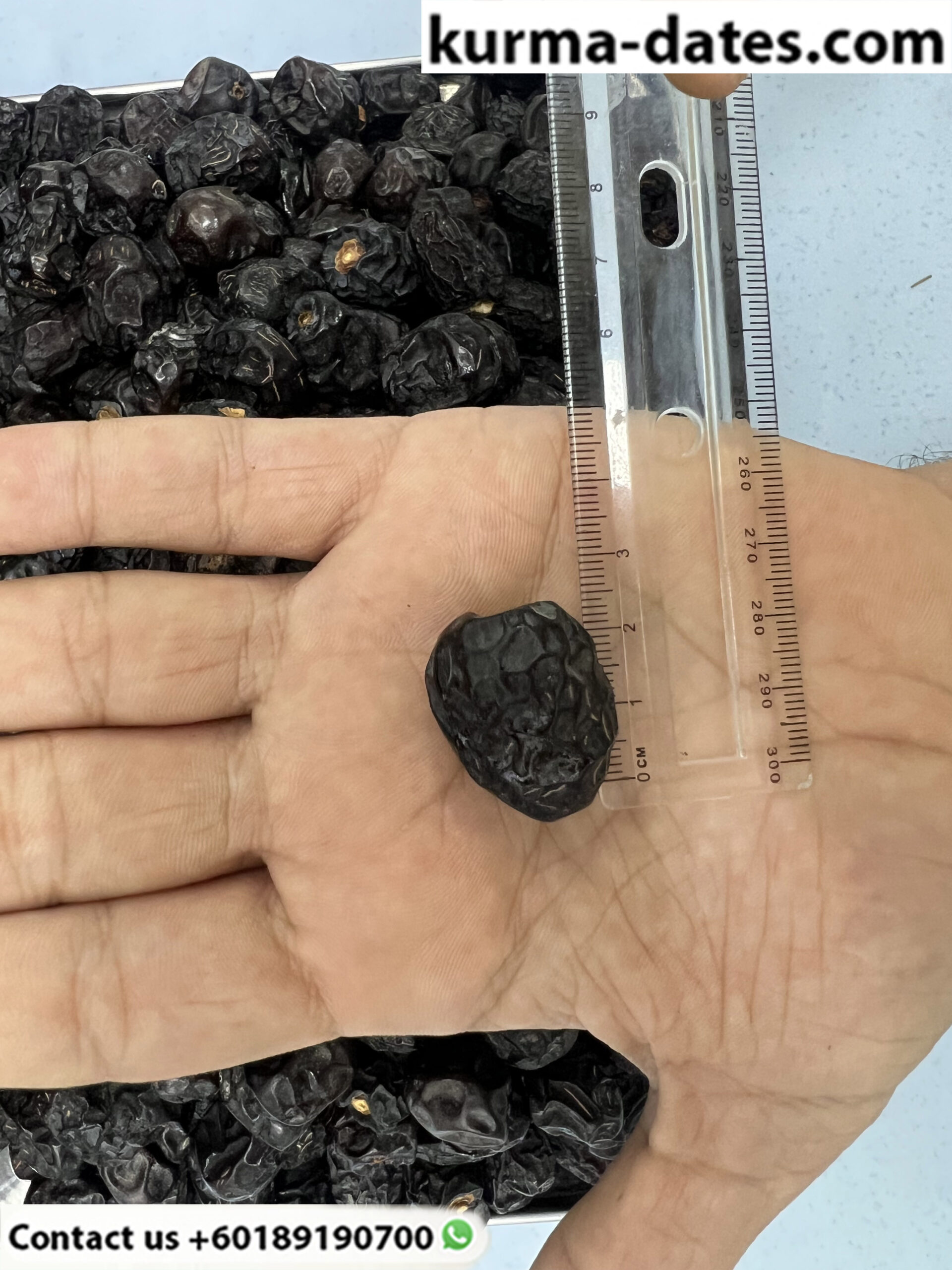 Color and size: They are medium-sized round dates with a dark black cherry color with hints of brown.